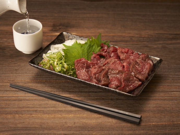 馬刺しをおつまみに仲間と一緒にお酒を楽しむ場合は、1人前30〜40gで十分です。一方、食事のメインとして馬刺しを楽しむなら、1人前80〜100g、2〜3人分なら150〜300gを目安にしてください。