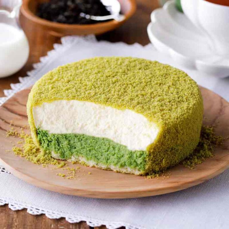 緑色のクラムがのったチーズケーキは春だけの抹茶味です。ベイクド部分にはほろ苦い宇治抹茶を混ぜ込み、レアチーズ部分にはジャージー牛乳を使ってミルクの風味が楽しめるチーズケーキとなっています。