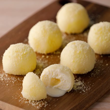 もちもちのお餅の中から、濃厚なミルクソースとレアチーズがじゅわっと溢れ出します。ミルクのコクとチーズの酸味が相性抜群で、1個で満足感がすごい…!
