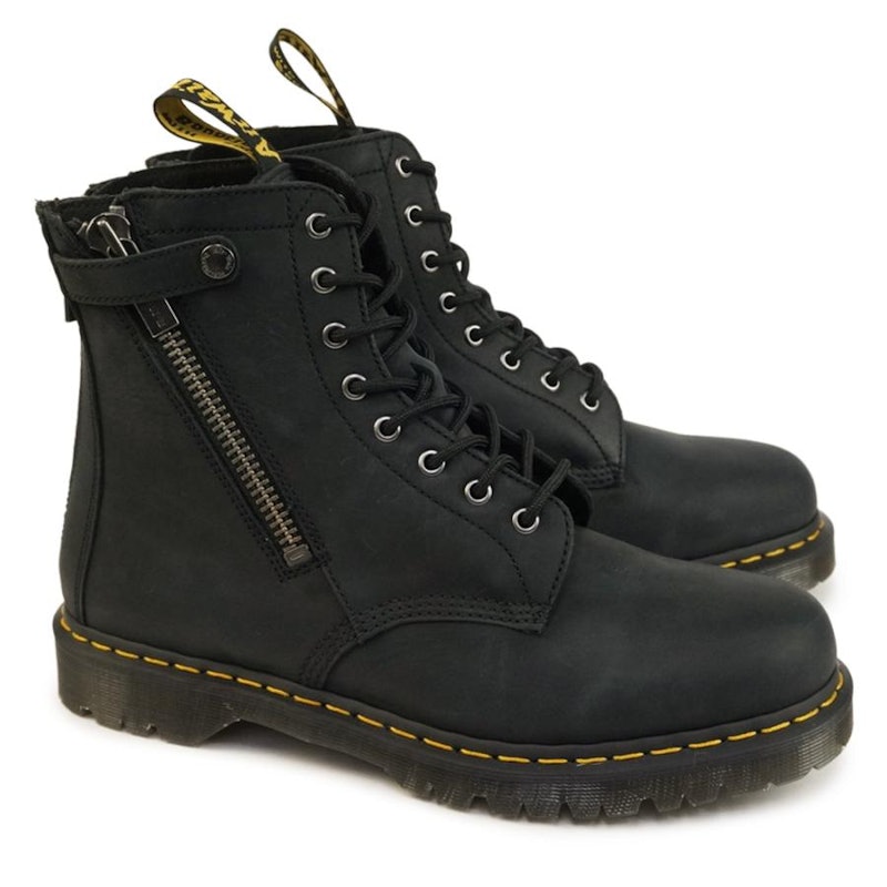 2か所のファスナーとリベットつきベルトのディテールが、定番1460とは異なるオルタナティブなムードを醸し出す、ワイルドなルックスのブーツ。アッパーには、オイル仕上げのフルグレインレザーを使用しています。経年変化を楽しみたい人におすすめです。